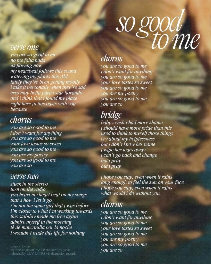 San Diego’s versatile artist and guitarist, PSCILA releases her angelic self-love anthem, “So Good To Me,” an ethereal track that encourages one to explore the power of self-love and nurturing rituals that foster inner peace. “So Good To Me” is featured on PSCILAs upcoming EP, “Lunatic,” which showcases her unique sound—a mesmerizing fusion of soulful R&B rhythms and bilingual flair that reflects her Mexican heritage.